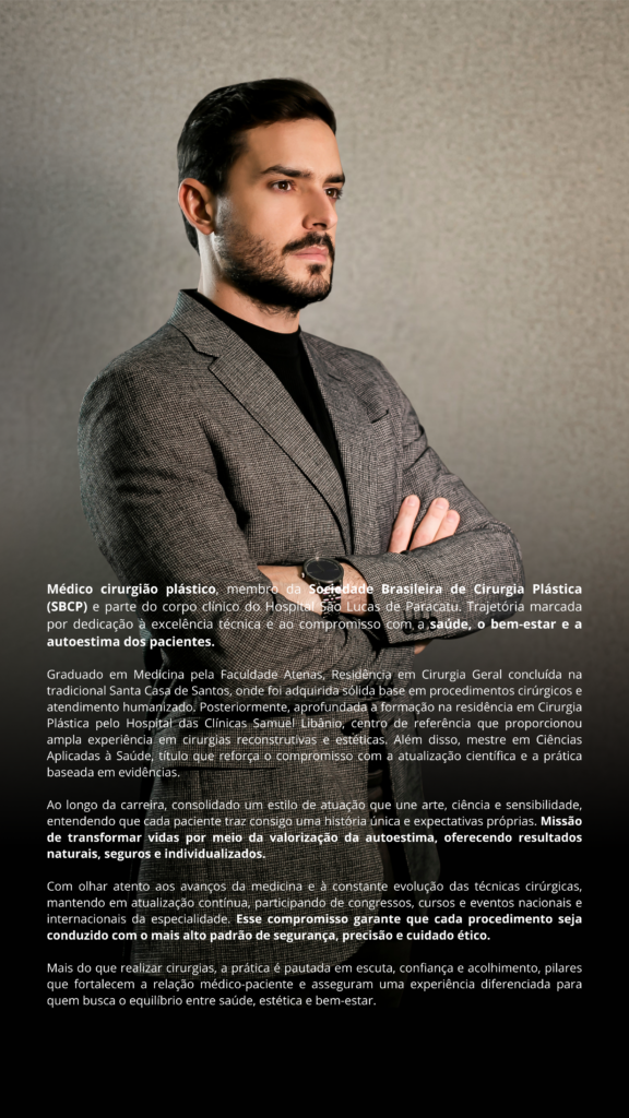 Médico cirurgião plástico, membro da Sociedade Brasileira de Cirurgia Plástica (SBCP) e parte do corpo clínico do Hospital São Lucas de Paracatu. Trajetória marcada por dedicação à excelência técnica e ao compromisso com a saúde, o bem-estar e a autoestima dos pacientes.